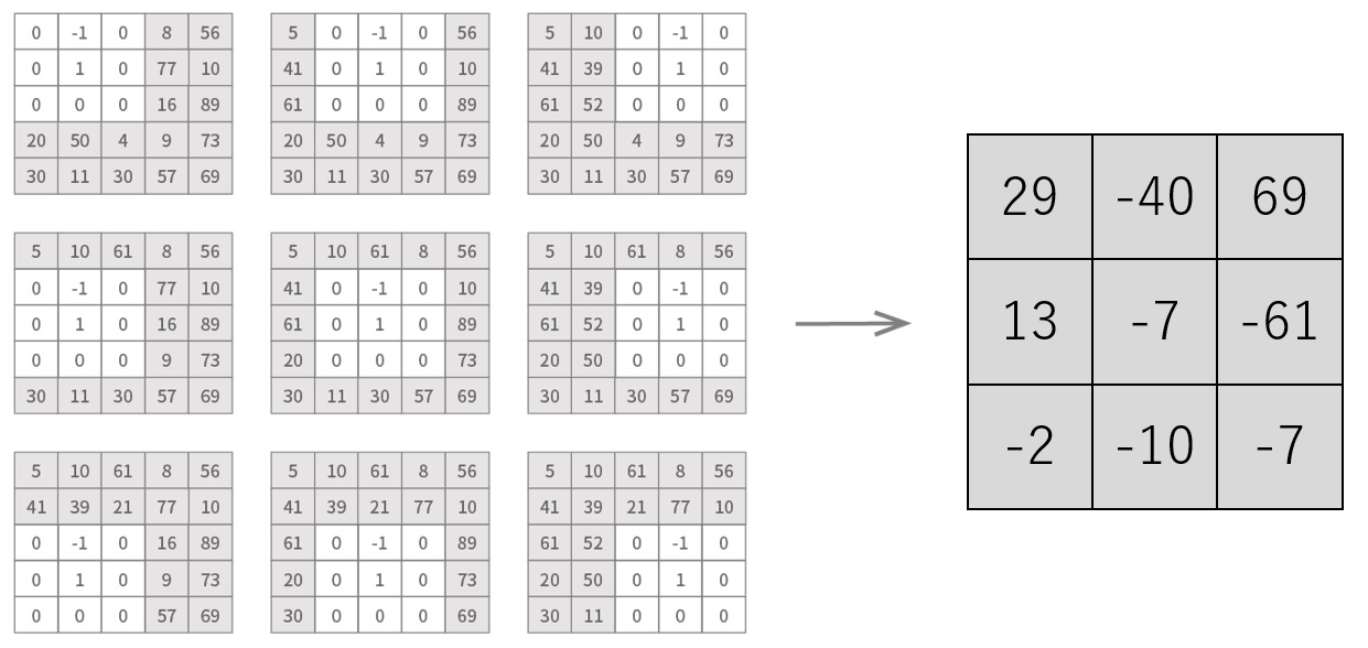 Where, we prepare a filter with three pixels in width and height, and the sliding distances for the convolution process are one pixel in width and height. Finally, we get an image with three pixels in width and height.